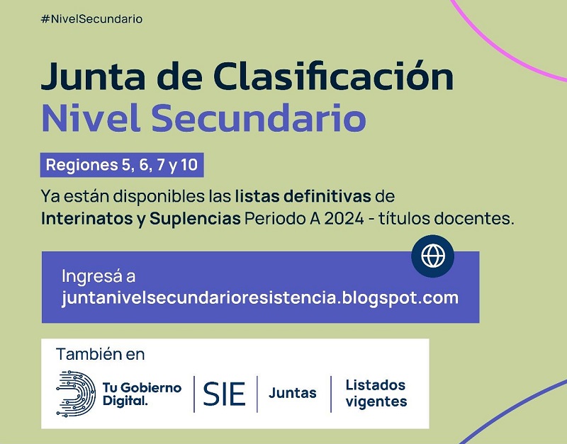El Ministerio de Educación de la Provincia, a través de la Junta de Clasificación de Nivel Secundario- Sede Resistencia- Regiones 5, 6, 7 y 10- informa que se encuentran publicadas las listas definitivas de Interinatos y Suplencias, Periodo A 2024- títulos docentes.