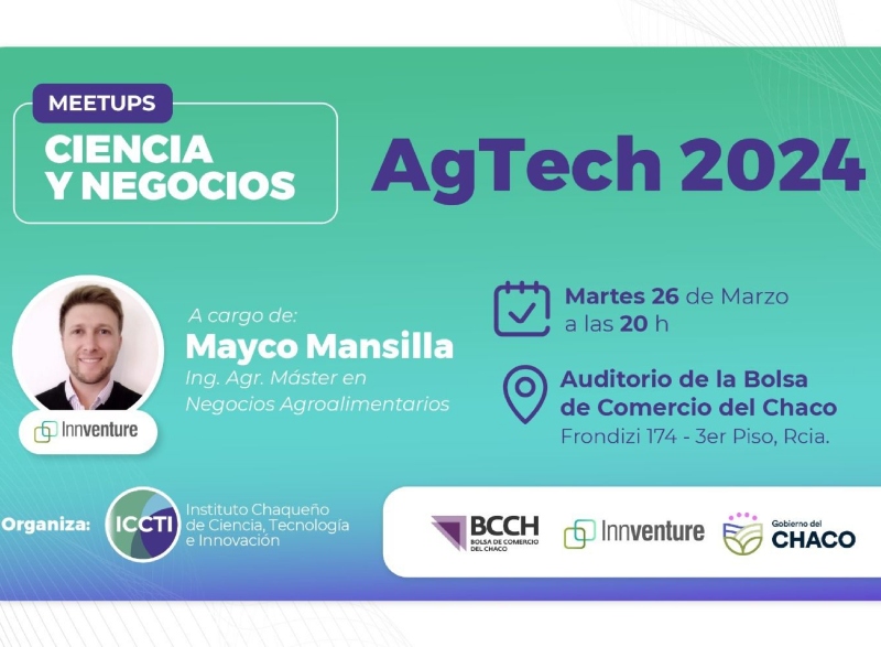 El Meetups Ciencia y Negocios es un ciclo de charlas sobre emprendedurismo científico, desarrollo tecnológico y capital emprendedor para la economía del conocimiento que impulsa la gestión del gobernador Leandro Zdero. El nuevo encuentro “AgTech 2024” se realizará el martes 26 de marzo, a las 20:00, en el Auditorio de la Bolsa de Comercio del Chaco (Frondizi 174, 3er piso – Resistencia). La actividad cuenta con cupo limitado y las personas interesadas en participar deberán completar el formulario de inscripción: bit.ly/meetups2024. El evento es organizado por el ICCTI y cuenta con el apoyo de la Bolsa de Comercio del Chaco y el fondo de inversión Innventure.