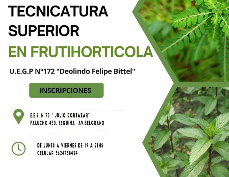 Desde la U.E.G.P N°172 Deolindo Felipe Bittel informaron que ya se encuentra abierta la inscripción a la Tecnicatura Superior en Producción Frutihortícola, en la EES N°75, Julio Cortázar (Falucho 450) de Resistencia.