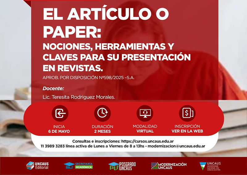 La Universidad Nacional del Chaco Austral (UNCAUS) abrió inscripciones para este nuevo Taller denominado “el artículo o paper: nociones, herramientas y claves para su presentación en revistas”, que iniciará las clases el 6 de mayo y se extenderá por dos meses, los días martes de 18:30 horas a 20 horas, con modalidad virtual sincrónica.