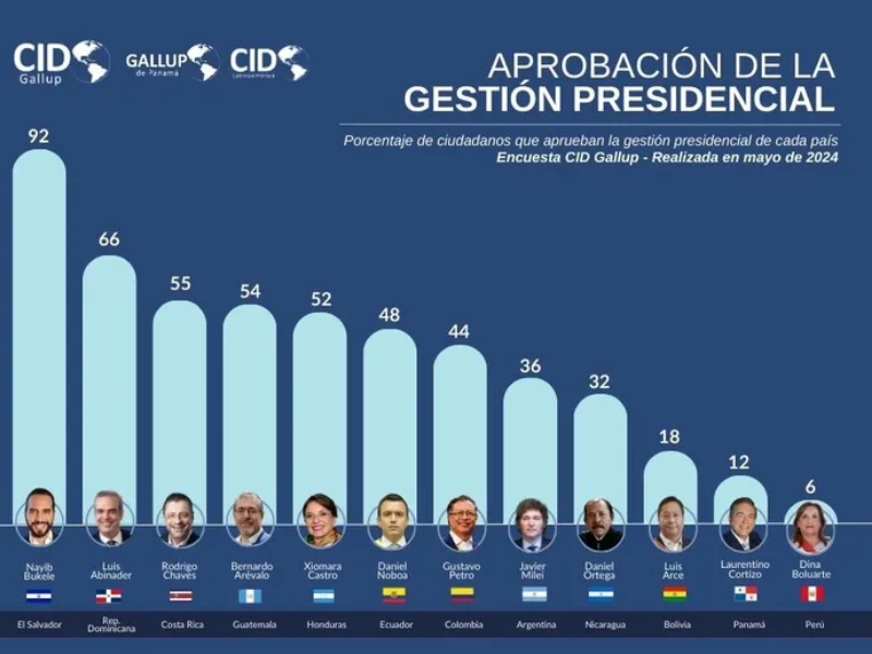 El salvadoreño Nayib Bukele lidera el ranking con un 92% de aprobación sobre su gestión. Detrás de Bukele, hay otros cuatro presidentes con más de 50 puntos de aprobación: Luis Abinader, República Dominicana (66%), Rodrigo Chávez, Costa Rica (55%), Bernardo Arévalo, Guatemala (54%) y Ximena Castro, Honduras (52%). Entre el 40% y el 50% CID Gallup reporta a Daniel Noboa, Ecuador (48%) y Gustavo Petro, Colombia (44%). Mientras que por debajo de ese guarismo, además de Javier Milei, aparecen Daniel Ortega, Nicaragua (32%), Luis Arce, Bolivia (18%), Laurentino Cortizo, Panamá (12%) y Dina Boluarte, Perú (6%).