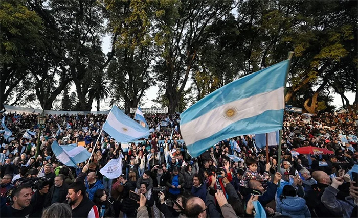 Entonces sonó primero Aurora y luego un cantante lírico entonó las estrofas del Himno Nacional, mientras las banderas flameaban sobre el parque. “Hola, ¿qué tal? ¿Cómo están todos?”, se escuchó. “Bueno, de San José 1111 a Parque Lezama, que es un lugar lindísimo, además”, dijo Cristina Fernández de Kirchner, una vez más con su voz proyectada desde dos torres de sonido.