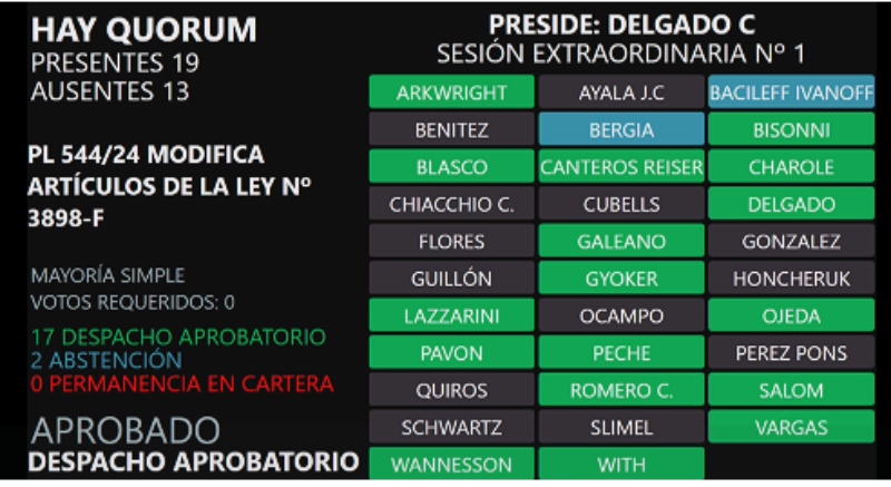 La ley se sancionó con el voto positivo de los diputados del interbloque JxC y de sus pares del CER. Se abstuvieron el diputado Juan José Bergia del NePAR y Darío Bacileff Ivanoff del Frente Integrador. El resto del interbloque Frente Chaqueño estuve ausente durante la votación, pero no en el debate.