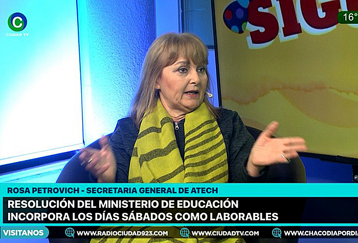 “Tuvimos una reunión ayer, donde surgió la novedad de la Resolución 1363, firmada por la ministra el 13 de mayo, donde incorpora el día sábado como laboral para el docente, desconociendo el régimen laboral”, comenzó diciendo Rosa Petrovich, titular de ATECH e integrante del Frente Gremial Docente.