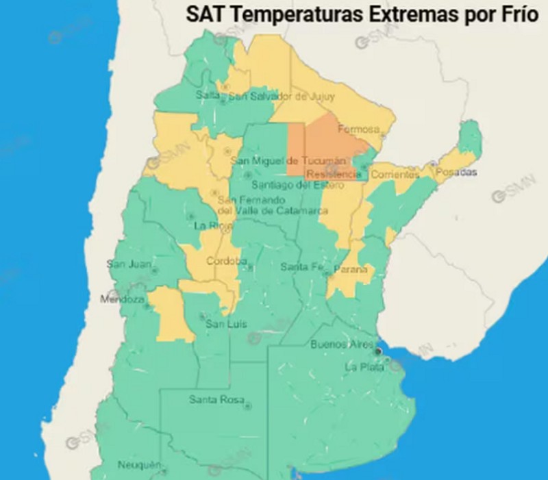 En tanto, en el resto de las provincias rige el nivel amarillo. En este caso, las bajas temperaturas pueden afectar a los grupos de riesgo, como niños, personas mayores de 65 años y con enfermedades crónicas.