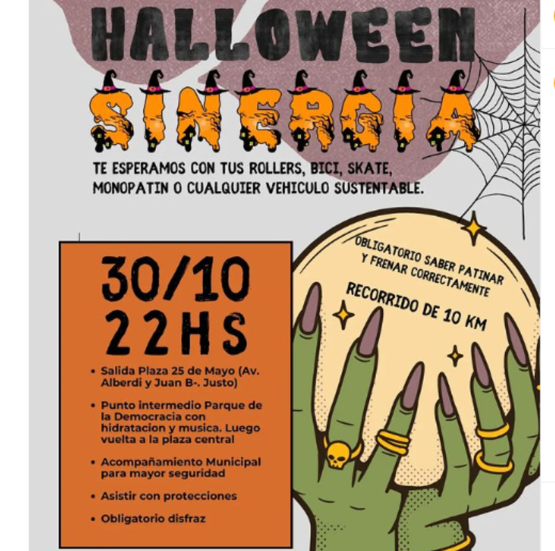 La salida será el lunes a las 22, desde el anfiteatro de la plaza 25 de Mayo, para realizar un recorrido urbano con todo tipo de vehículo sustentable para celebrar Halloween. El punto intermedio será el Parque de la Democracia para regresar a la plaza central.