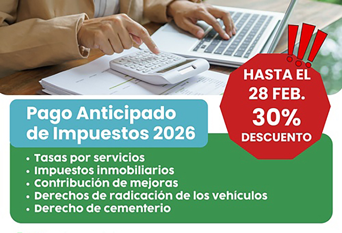 El Municipio de la Ciudad Termal, a través de la Secretaría de Economía, recuerda que hasta este sábado 28 de febrero se podrá acceder al Pago Anticipado de Impuestos 2026, una medida que permite a los contribuyentes obtener un 30% de descuento.