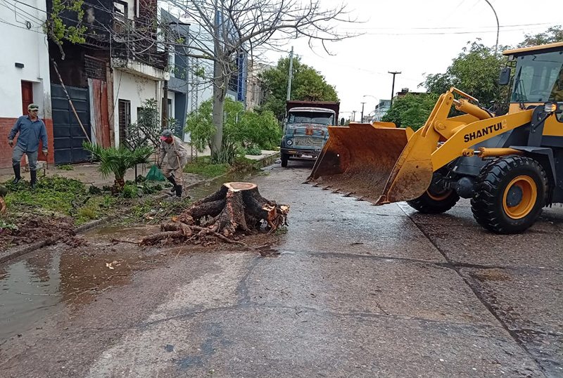 Más allá del drenaje hídrico, el temporal estuvo acompañado por fuertes ráfagas de viento que provocaron daños en el arbolado público. Por este motivo, cuadrillas de la Secretaría de Servicios Públicos se encuentran recorriendo la ciudad para la recolección de ramas y árboles caídos que obstruían la vía pública o representaban un riesgo para los vecinos.