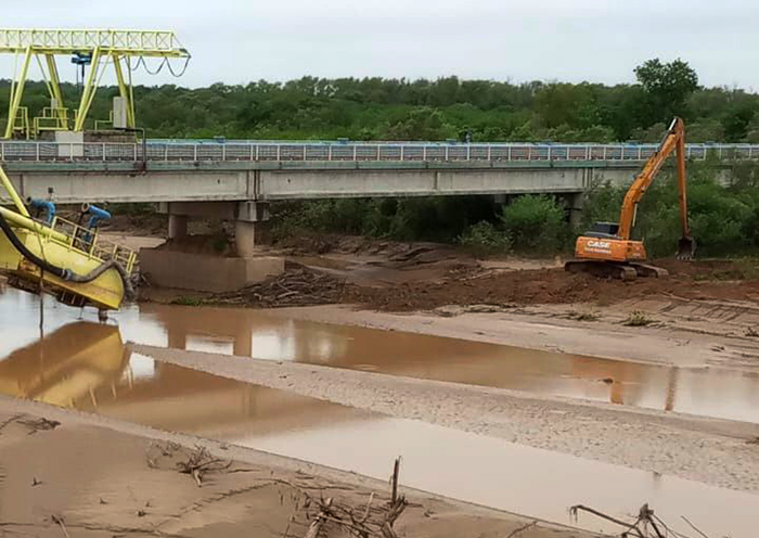 A su vez, el jefe de la Planta de Puerto Lavalle, Alejandro Ruiz Diaz y su equipo técnico realizan el mantenimiento y mejora en distintos puntos de la planta, mientras se trabaja en la profundización del canal del río Bermejo hacia la Toma.