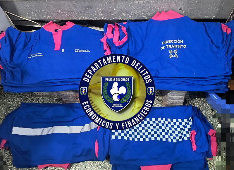 Este sábado, alrededor de las 13 horas, efectivos de la División Delitos Económicos secuestraron 45 chombas que tenían impreso “Dirección de Tránsito-Gobierno de Resistencia” y eran vendidos sin autorización. Un ciudadano fue notificado de las actuaciones por disposición de la fiscalía.