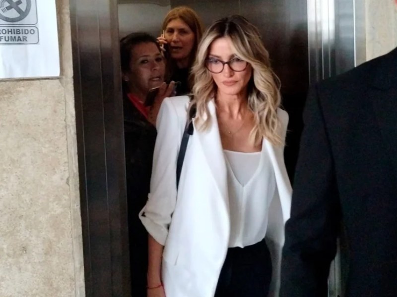 La modelo ingresó junto a Fernando Burlando a la fiscalía de González en el quinto piso de Comodoro Py 2002 para declarar bajo juramento de verdad en relación a si vio agresiones durante su paso laboral o privado por la residencia de Olivos.