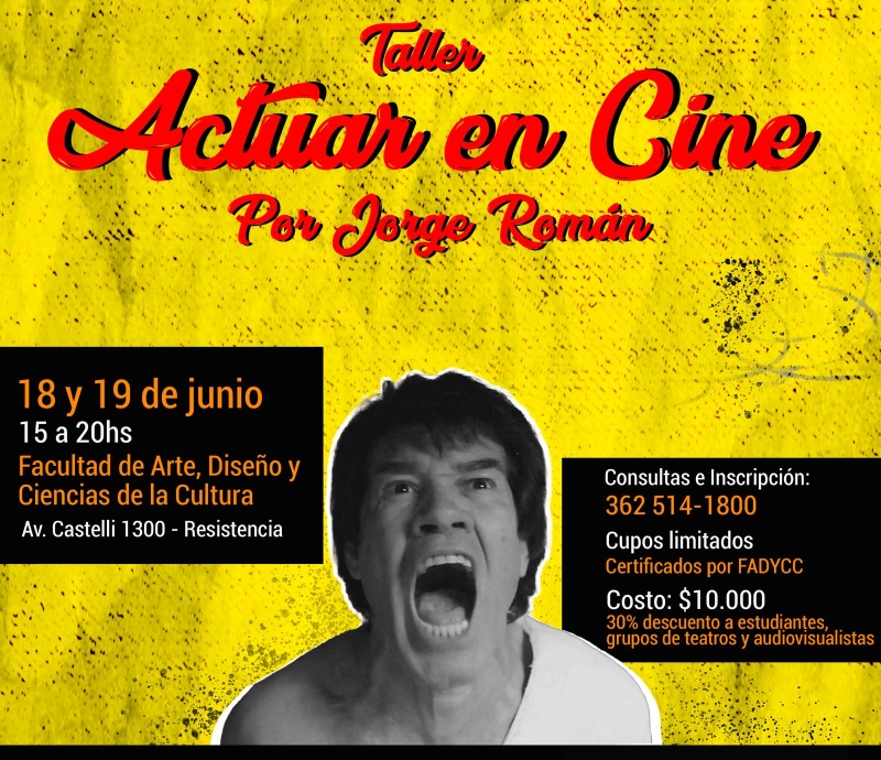 El martes 18 y miércoles 19 de junio, de 15 a 20, el reconocido actor de cine y teatro Jorge Román coordinará el taller “Actuar en cine”. La capacitación se realizará en la sede de la Facultad de Artes, Diseño y Ciencias de la Cultura (Av. Castelli 1300) de Resistencia, y cuenta con el apoyo del Instituto de Cultura del Chaco.