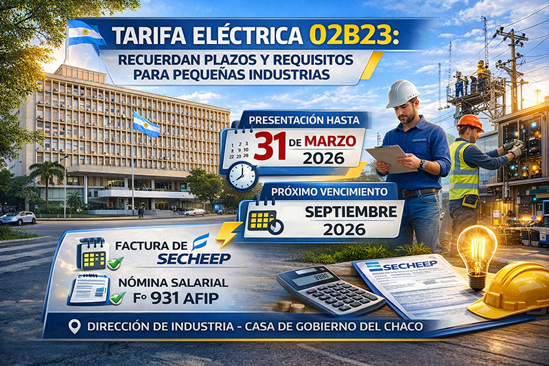 La Subsecretaría de Industria, del Ministerio de la Producción y el Desarrollo Sostenible, informó que continúa vigente el plazo para cumplimentar la documentación actualizada correspondiente a la Tarifa Eléctrica 02B23 destinada a pequeñas industrias.