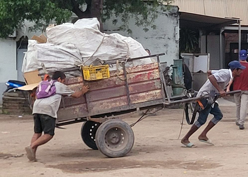Ultimamente y por exigencia de algunos acopiadores de materiales reciclables, pudo verse a muchos “jinetes” o conductores de los carros en cuestión, ejerciendo la fuerza necesaria para trasladar el carro, reemplazando al animal,.