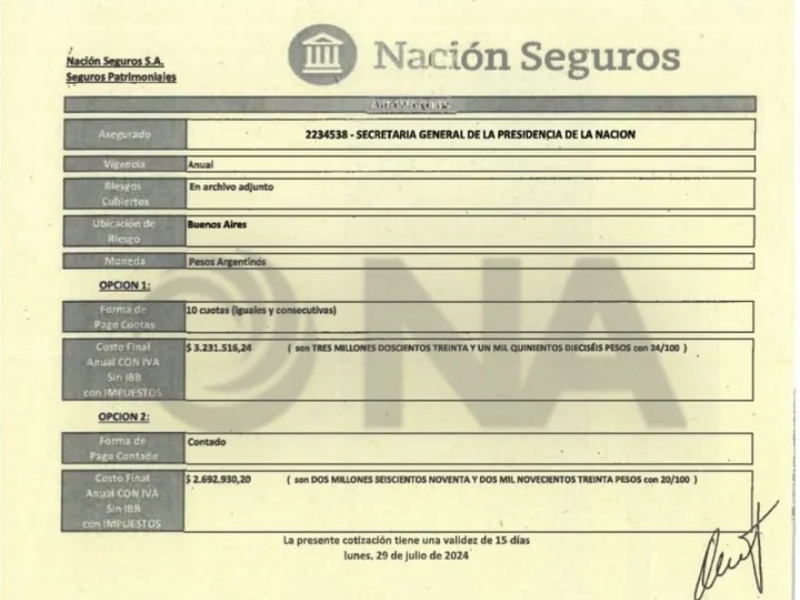 La contratación a la que accedió la agencia Noticias Argentinas, por un total de $2.692.930,20 (unos 1.965 dólares al tipo de cambio oficial), fue realizada de manera directa a través de un expediente firmado por la subsecretaría de Planificación General de la Secretaría General de la Presidencia, a cargo de Karina Milei, María Belén Agudiez y Alfonso José Torres, el responsable de Nación Seguros.