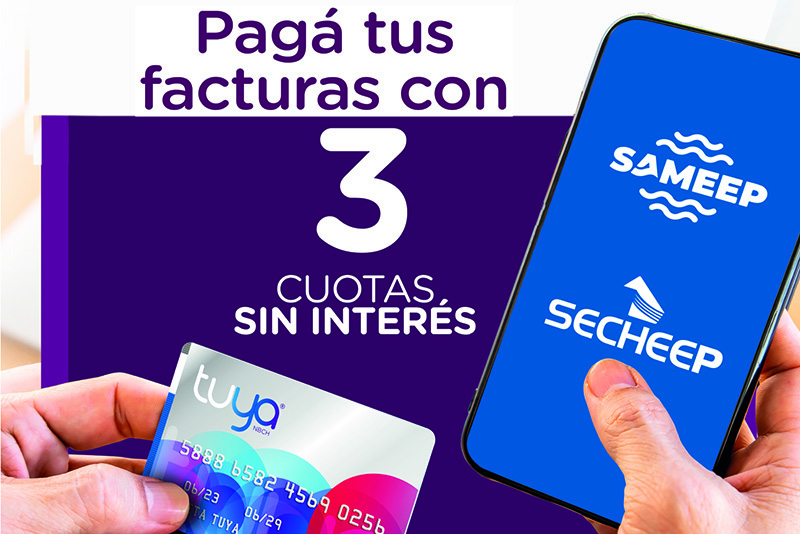 Nuevo Banco del Chaco recuerda las opciones de pago y financiamiento disponibles para abonar las boletas de agua y de luz en 3 cuotas sin interés con tarjeta Tuya, a través de las plataformas digitales y en las oficinas presenciales de Sameep y Secheep. Con tarjeta Tuya los pagos pueden ser financiados en 3 cuotas sin interés o 5 y 9 cuotas fijas con un costo financiero mínimo.