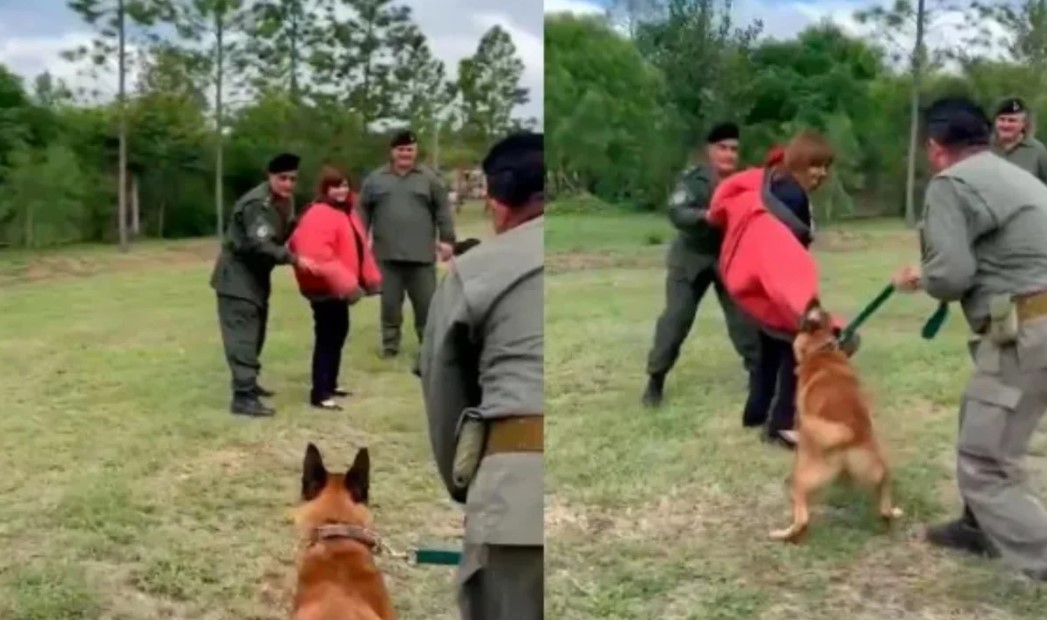 Acto seguido, mientras era escoltada por tres oficiales de seguridad, Bullrich fue atacada por uno de los ovejeros alemanes entrenados. Si bien las imágenes pueden resultar impresionables, la ministra no sufrió ningún tipo de herida y la prueba fue exitosa.