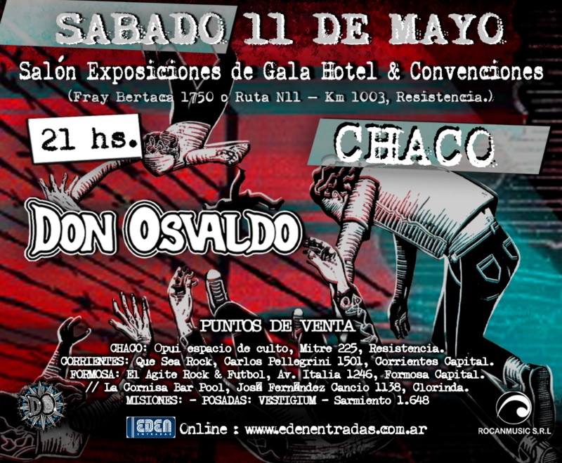 El recital tendrá lugar en el Salón Exposiciones de Gala Hotel & Convenciones (Fray Bertaca 1750 o Ruta N° 11 – Km 1003) de Resistencia el sábado 11 de mayo, desde las 21 hs. Las entradas anticipadas se pueden adquirir por sistema www.edenentradas.com.ar y en los puntos de venta habilitados.