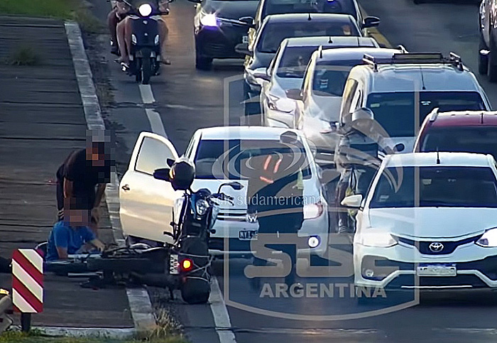 De acuerdo con las imágenes captadas por las cámaras de seguridad del sistema SISE, el joven que conducía la motocicleta terminó sobre la banquina con heridas en su pierna derecha. En el lugar se presume que el automóvil, en el que circulaban un hombre y una mujer, habría sido el otro vehículo involucrado en el choque.
