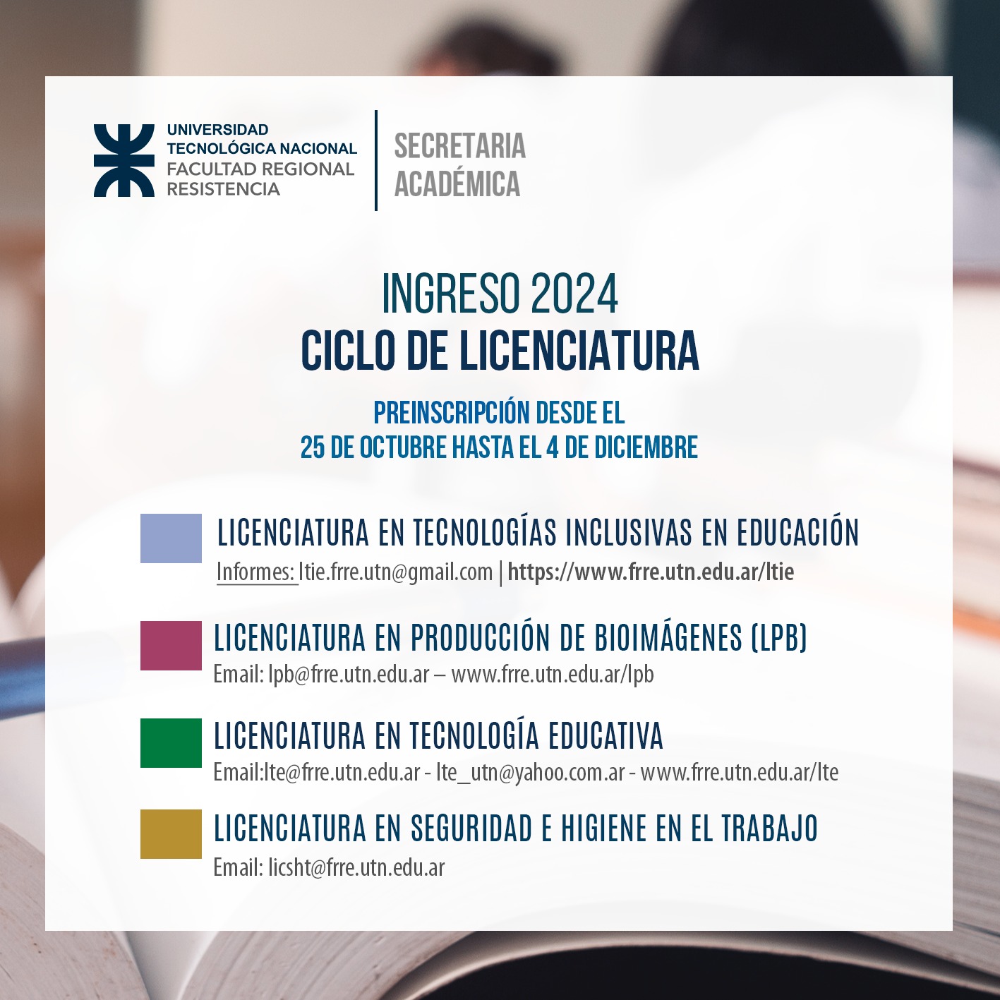 También desde este miércoles 25 de octubre se encuentra abierta la inscripción a tres carreras cortas en la Facultad Regional Resistencia de UTN: Tecnicatura Universitaria en Programación, Tecnicatura Universitaria en Mecatrónica y Tecnicatura Universitaria en Operación y Mantenimiento de Redes Eléctricas.