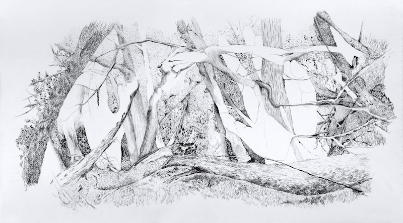 En esta exhibición, sus dibujos y pinturas se presentan de manera orgánica, a modo de conversación, se encuentran, se mezclan. Espesores, texturas de piel, piedras, cortezas y marañas, fauna, flora y formaciones minerales son cápsulas del tiempo hacia geografías fantásticas. Paisajes trabajados con la dedicación de un cultivo. Refugios donde la vida siempre prevalece.